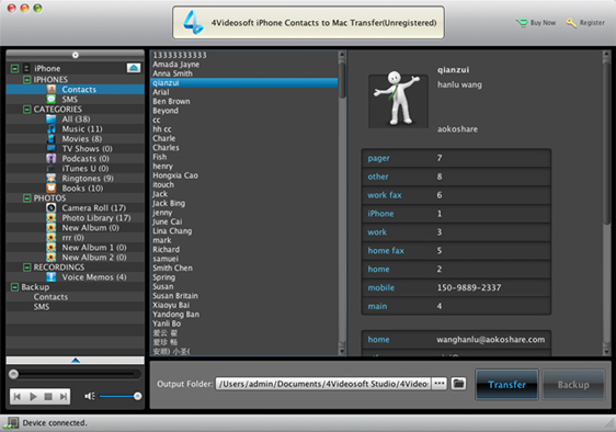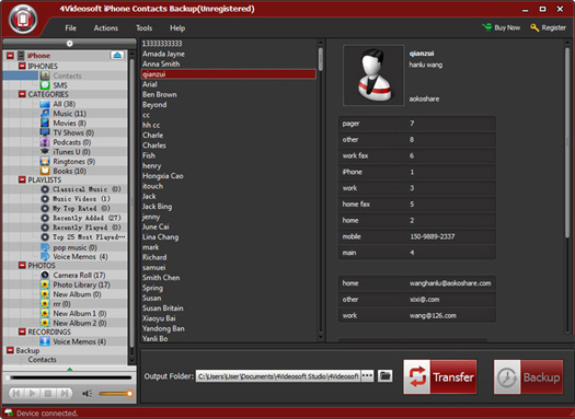 4Videosoft iPhone Contacts Backup lets you transfer, manage, and restore your iPhone contacts, ensuring that your life can continue uninterrupted should you lose or destroy your iPhone. With 4Videosoft iPhone Contacts Backup, you'll be able to back up your iPhone contacts to your computer or to iTunes, as well as your text messages. Multiple iPhone versions are supported, for the ultimate in backup flexibility. You can also choose to back up all of your contacts and text messages, or only selected ones that really mean something to you.