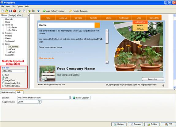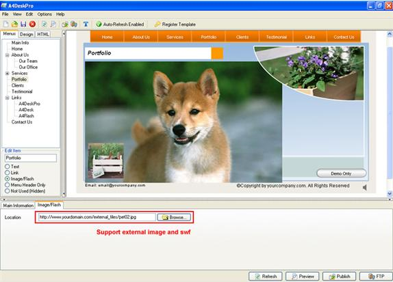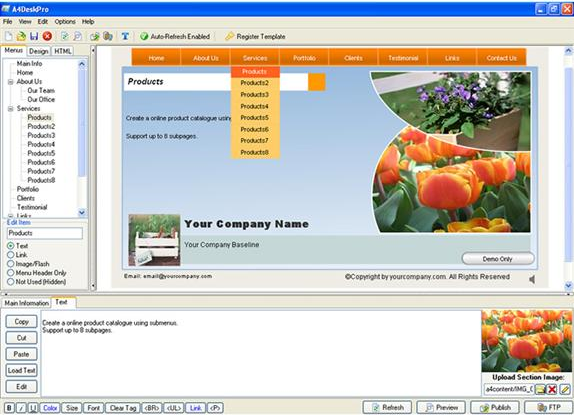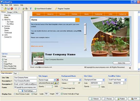 A4DeskPro gets you started quickly with your choice of 30 different supplied website templates. Just pick one, then customize to your needs with your own color themes, text, images, and background music. A few clicks later, and you're running your very own Flash website that's compatible with every internet browser!