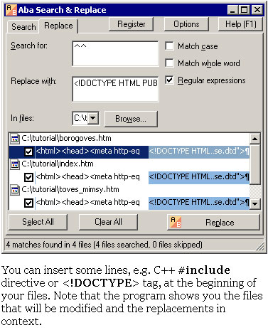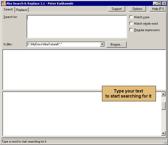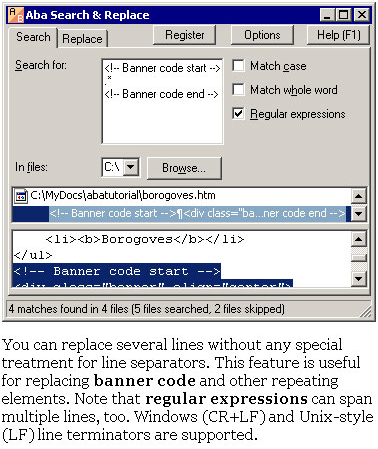 Aba Search and Replace is a tool for replacing text in and across multiple files. With Aba, you can quickly correct errors on your web pages, replace banners and copyright notices, change method names, and perform other text-processing tasks.