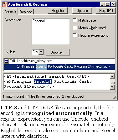 - Search and replace in Unicode files (UTF-8, UTF-16).