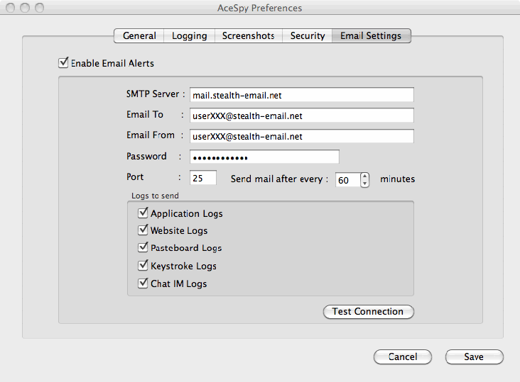 AceSpy silently monitors all activity that takes place on a target computer. With AceSpy, you’ll be able to record and forward chat sessions, emails, website activity, keystrokes, and more, with hourly reports sent directly to your email inbox! If someone receives an email on a monitored computer, a copy gets sent to YOUR email address too! And if that certain someone replies to that email, you get a copy of the reply, too!