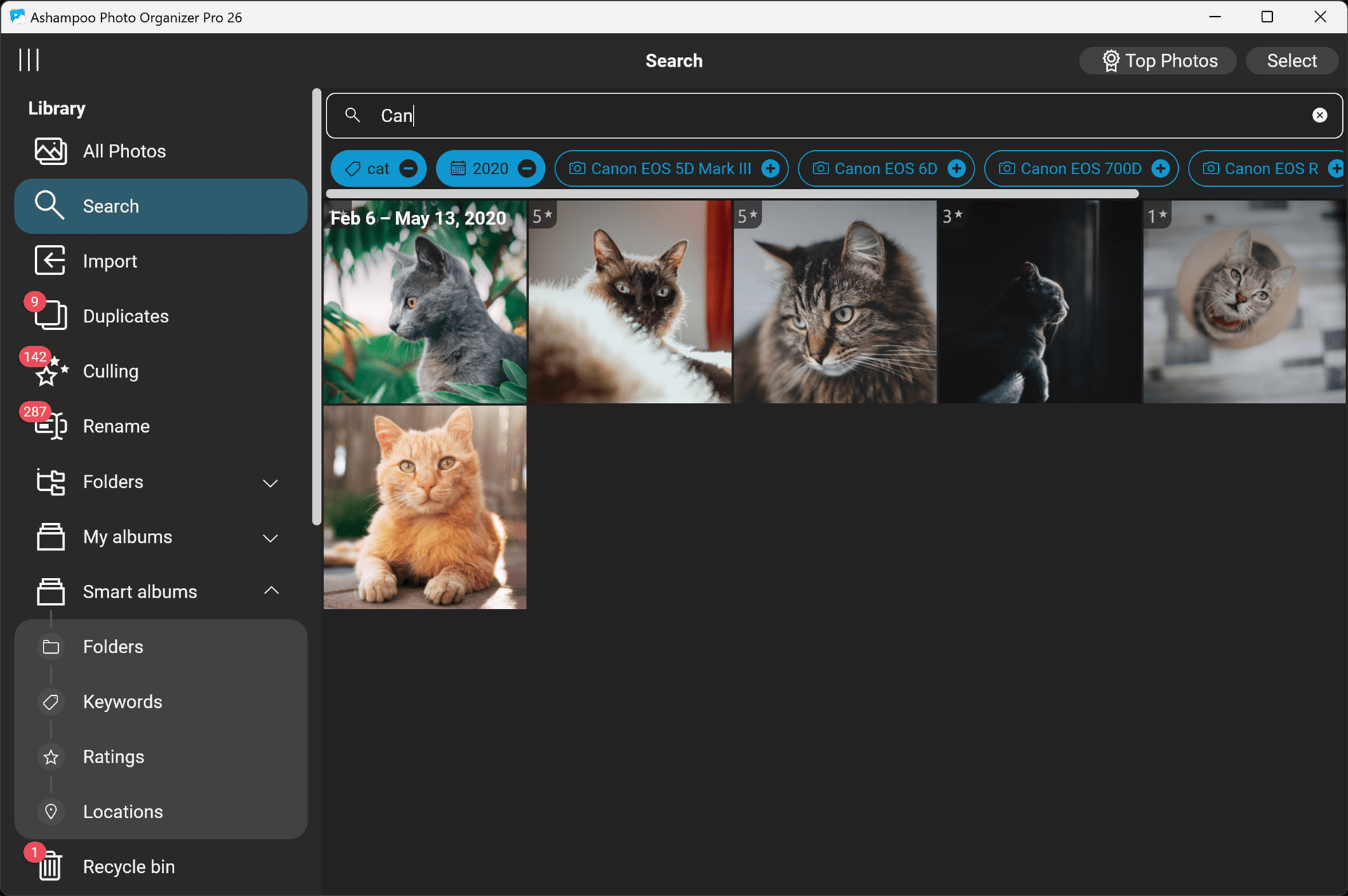 • Smart albums with automatic sorting by location, camera, keywords, etc.