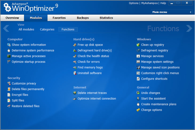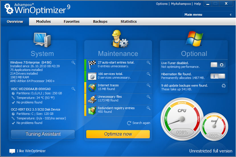 Ashampoo WinOptimizer offers the very finest in handholding, for those without advanced technical expertise. Just answer a few questions about how you use your system, and Tuning Assistant will implement presets designed to optimize your computer for your own personalized usage patterns! Throw in the ability to undelete files, one-click optimization, and file encryption, and you'll find no better way to renew your Windows machine than with Ashampoo WinOptimizer!