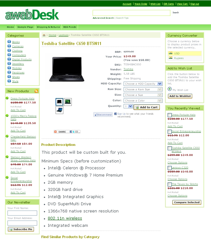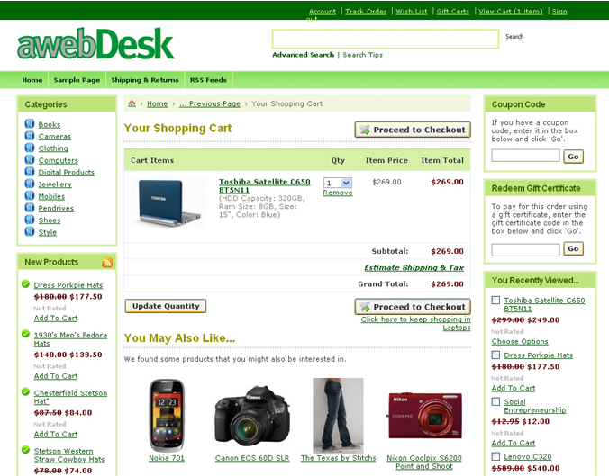 A powerful AJAX-based web interface gives you absolute control over taxes, inventory control, user permissions, currencies, and contact management. AWebDesk Shopping Cart Software is even integrated with Facebook, giving your customers the power to Like your brand and, essentially, giving your business free advertising on the world’s largest social network!