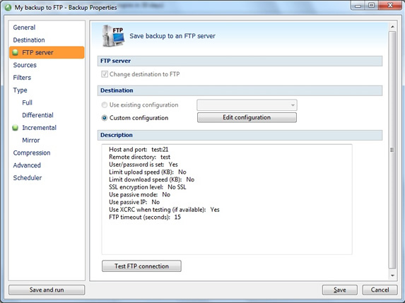 With Backup2 FTP, you can create full, differential, and incremental backups that are conveniently stored on your remote FTP server in handy, space-saving ZIP archive files. At your option, you may also choose to create one-to-one mirrored backups of your files.