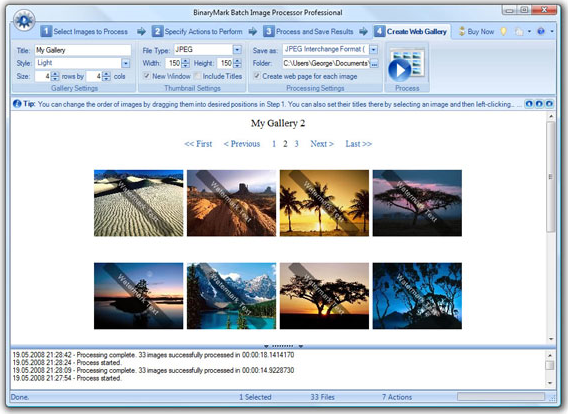 Batch Image Processor 2008 also allows you to create web galleries of images, with full control over thumbnail sizes, number of pictures in each row and column, and navigation controls. Of course, you can preview exactly how your web gallery will look and feel before you publish it!