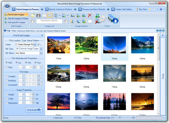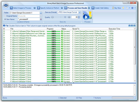 Batch Image Processor 2008 can quickly find your image files given a directory, an individual file name, or by searching, and can load every major graphics format out there. And it converts too! After you've finished applying your actions you can save your images to any of the aforementioned graphic formats, with extended support for advanced JPEG and GIF settings. You can even batch rename your image set!