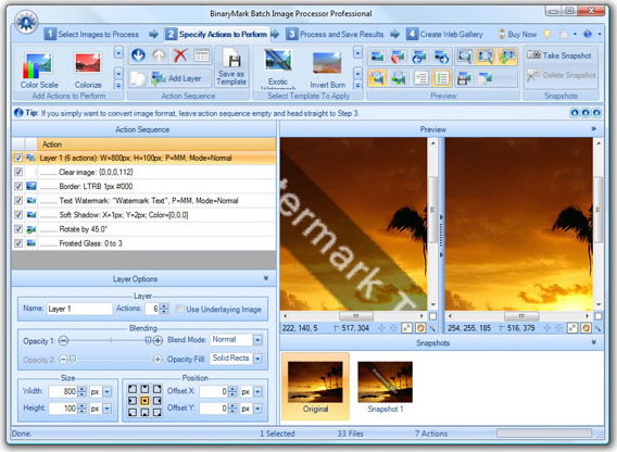 In addition to having more than 90 built-in actions, the Professional Edition is unique for featuring full layers support. It can apply unlimited number of actions to each layer individually, and can even paint layers using any of the 20 blending modes (like Screen and Overlay). Batch Image Processor 2008 gives you unprecedented control over your images and allows you to create truly impressive and professional effects!