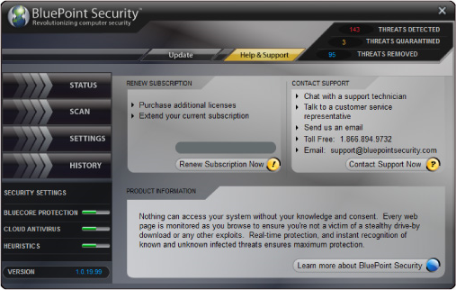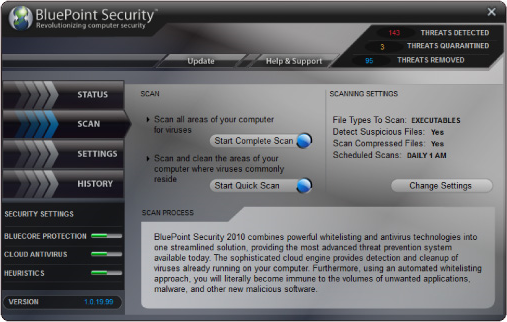 BluePoint Security 2010 works against all known AND unknown threats! Malware is automatically detected and removed! Even email attachments are scrutinized by BluePoint Security 2010!
