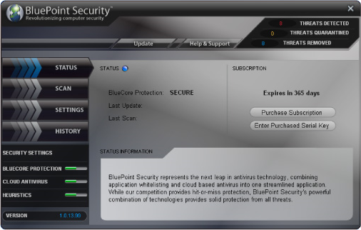 BluePoint Security 2010 uses an innovative approach to blocking viruses and malware! By simply blocking any "unknown" files, BluePoint Security 2010 provides you with secure antivirus protection that doesn't depend on virus signature files or behavioral detection. Malicious software gets sacked before it gets a chance to infect your computer!