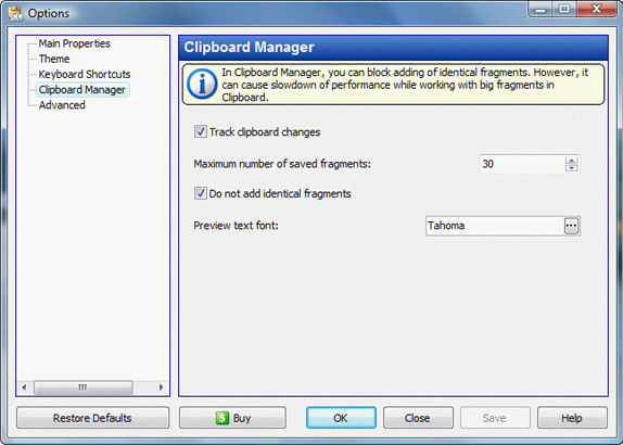 Comfort Clipboard will revolutionize the way you look at the computer clipboard. It provides full control over 'clipped' data and saves it so that you can use it again and again and again. Now you don't have to worry that copying one thing will erase something else! Best of all, Comfort Clipboard guarantees that the clipboard contents will be saved, even in the case of a system crash or power failure.
