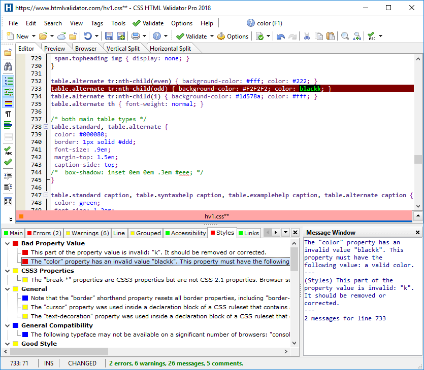 CSS HTML Validator will help you improve your search engine rankings, find and fix HTML & CSS problems and misspelled words, improve your website’s usability, and find broken links before your visitors do. To check an HTML or CSS document, just open a file or URL in the built-in editor and then press F6. The results are quickly displayed at the bottom.