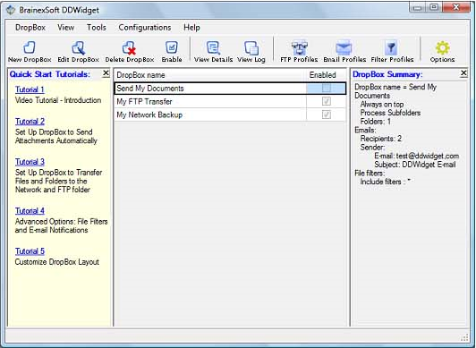Just as you set up a DDWidget Pro dropbox to send shared files to multiple recipients, you can also set up multiple DDWidget Pro dropboxes! Keep a dropbox for work, another for family members, and a third for your poker group! Each dropbox is configured with its own settings, recipients, and method of delivery. DDWidget Pro provides comprehensive log files for each delivery session with detailed delivery statistics, so you'll always be assured that your files arrived safely at their destination.