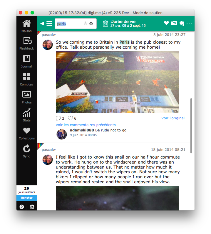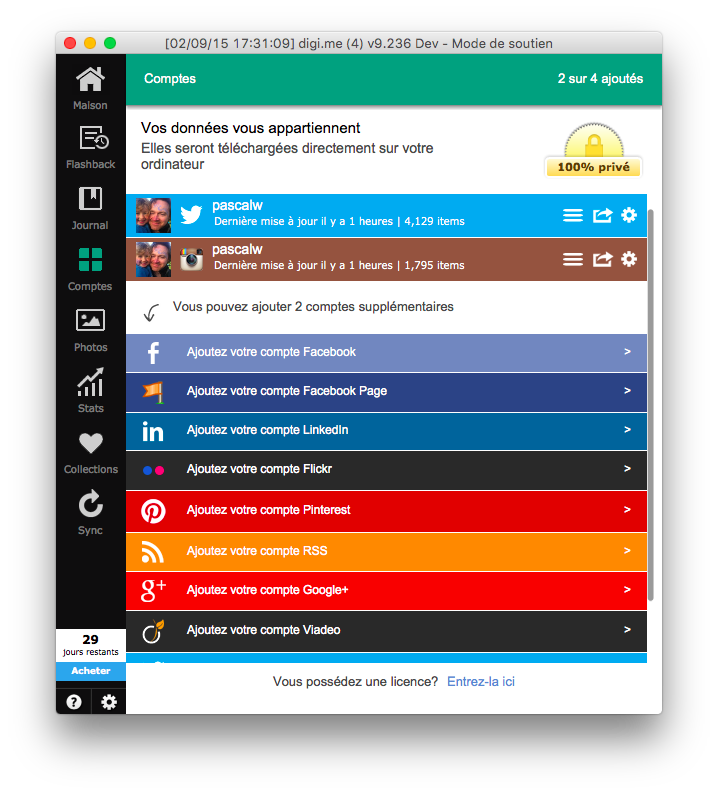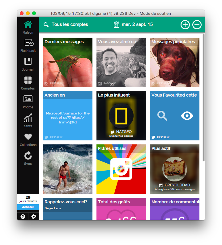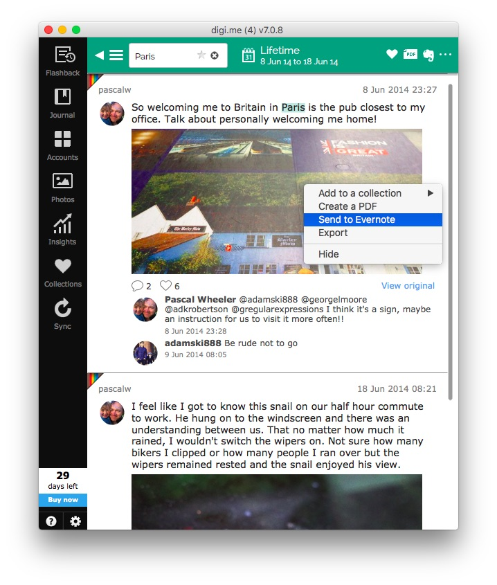 Having digi.me means having everything right in front of you – every Instagram photo, things like your timeline, photos and updates on Facebook, your Tweets DM's and mentions, and all of your professional contacts on LinkedIn and lots more. Plus, with a powerful search engine, smart calendar, and journal, any post you can think of is readily found with just a keystroke!