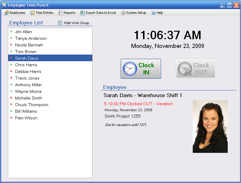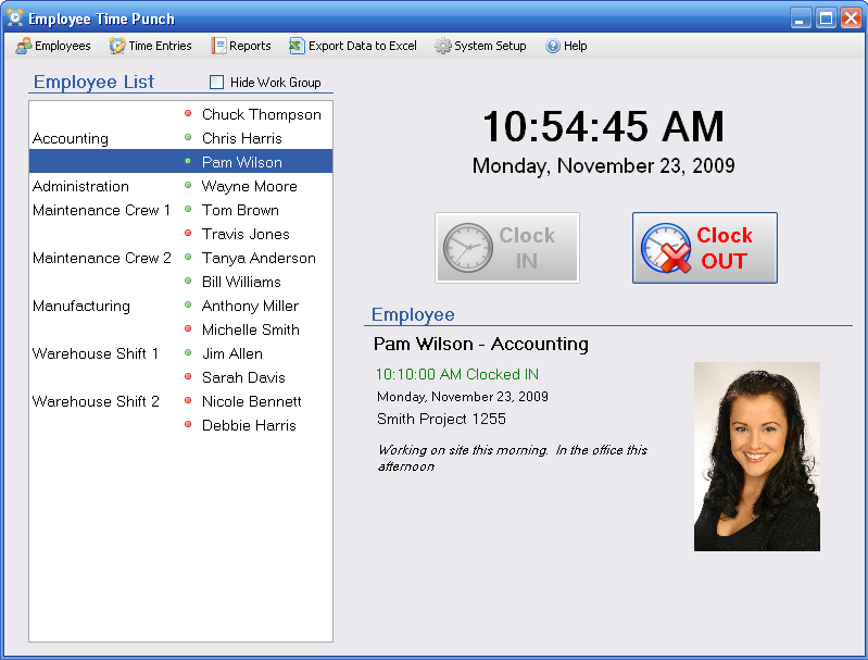 Designed to be easy to use by virtually anyone, Employee Time Punch presents your employees with a simple and intuitive screen where your staff selects their name, clicks Clock In or Clock Out, and enters their optional password. That's it! But the benefit of this wonderful piece of software is that your employees can leave notes in the application to let others know valuable information about what they're working on and where they are. A well-informed work crew is a productive work crew!
