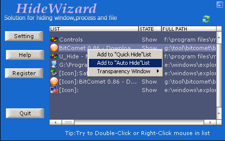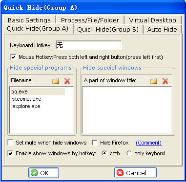 - Hide windows and programs quickly via mouse or keyboard hotkeys.