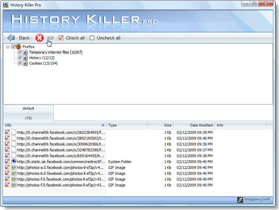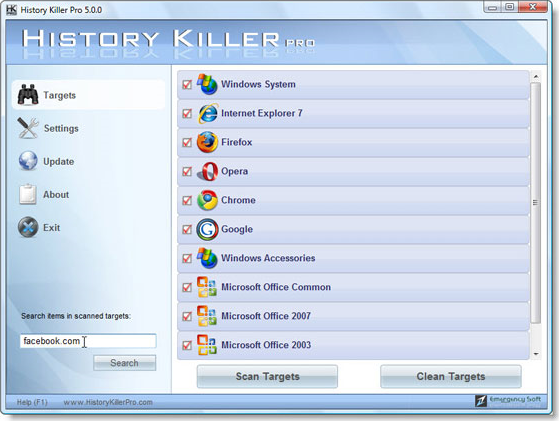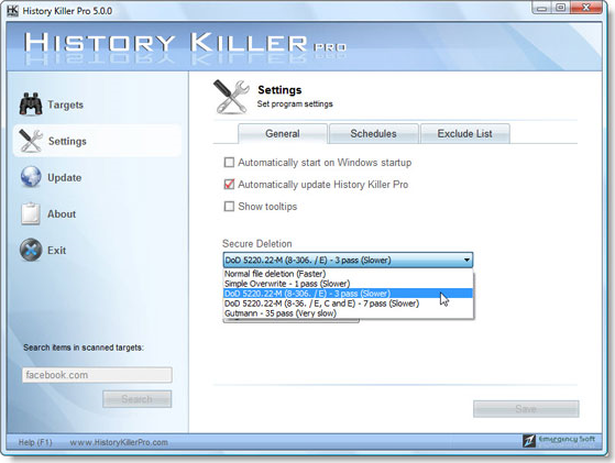 You could let History Killer Pro run wild on your machine, and let it do its thing, or you can select specific areas of your computer you would like "cleansed" by the program. You can even search for trace evidence that is left by a particular application, like Facebook, and review what's stored on your machine before deciding to delete it.