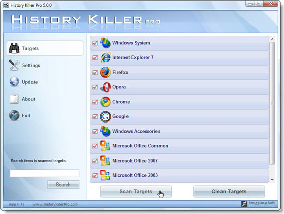 History Killer Pro protects your privacy, both for online applications as well as offline activities. Using methods that meet the Department of Defense and National Security Agency standards for permanent data removal, History Killer Pro removes all identifying traces of your usage history from temporary files and folders, recycle bin, unnecessary history, prefetch files, cookies, cache, browser history, Microsoft Office temporary files, and many more nooks and crannies that you've probably never even considered. Even if you use the most cutting-edge internet browsers and tools, like Opera, Google Chrome, Google Toolbar, and Google Quicksearch, you're covered by the latest and greatest version of History Killer Pro!