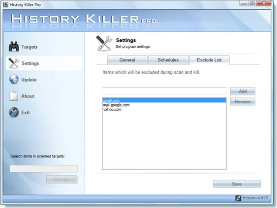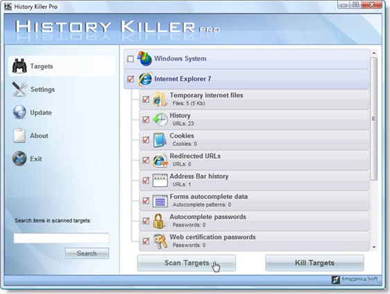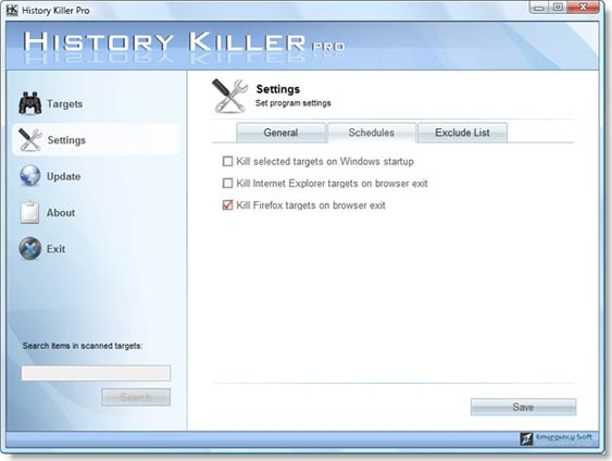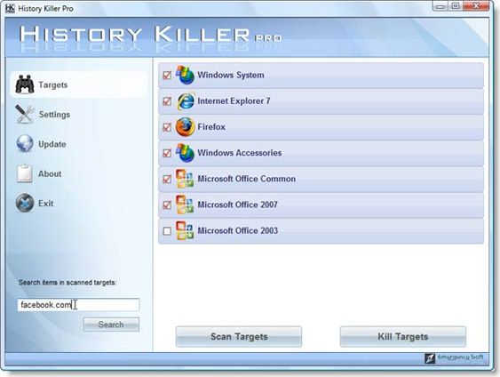 You could let History Killer Pro run wild on your machine, and let it do its thing, or you can select specific areas of your computer you would like "cleansed" by the program. You can even search for trace evidence that is left by a particular application, like Facebook, and review what's stored on your machine before deciding to delete it.