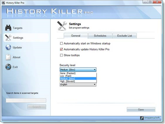 History Killer Pro protects your privacy, both for online applications as well as offline activities. Using methods that meet the Department of Defense and National Security Agency standards for permanent data removal, History Killer Pro removes all identifying traces of your usage history from temporary files and folders, recycle bin, unnecessary history, prefetch files, cookies, cache, browser history, Microsoft Office temporary files, and many more nooks and crannies that you've probably never even considered.