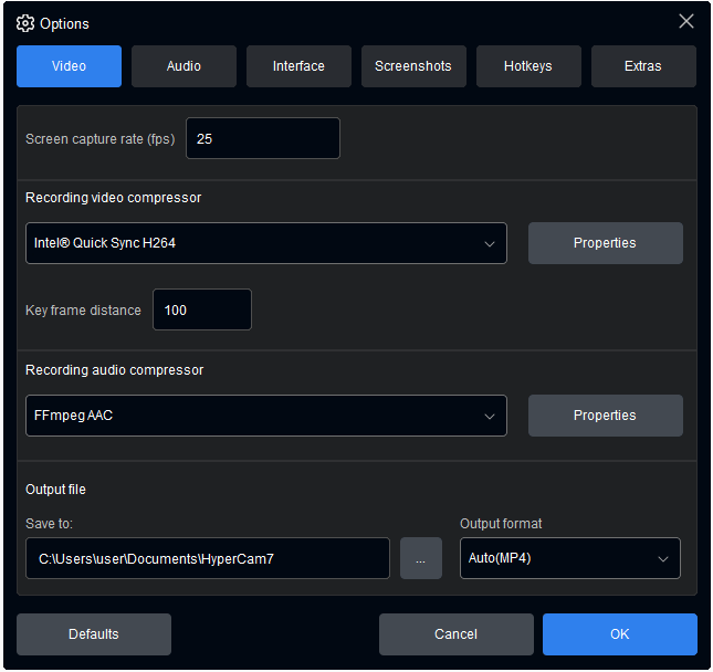 - Applying recommended video compressor's settings based on the capture resolution and frame rate