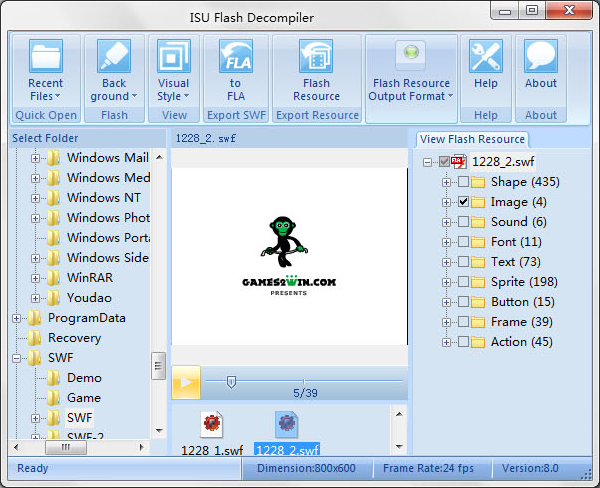 ISU Flash Decompiler offers full support for Adobe Flash CS3, CS4, and CS5, as well as ActionScript 2.0 and 3.0. And if you're comfortable with Microsoft Office 2007, you'll be able to jump into ISU Flash Decompiler with both feet, after you feast your eyes on its comfortable and familiar interface!