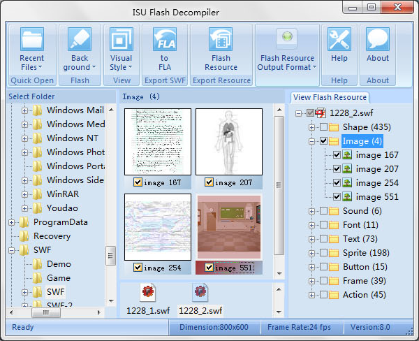 ISU Flash Decompiler gives you the power to convert SWF files to FLA and FLEX code, giving you an easy way to get your source back after a crash or deconstruct cool Flash content that you find online. With ISU Flash Decompiler, you'll be able to extract resources like shapes, images, text, sound, video, sprites, even ActionScript content. Plus, you can convert these resources into their native file formats, like WAV, MP3, JPEG, PNG, TXT, HTML, and more. How complicated is this extract process? How about one click to export?