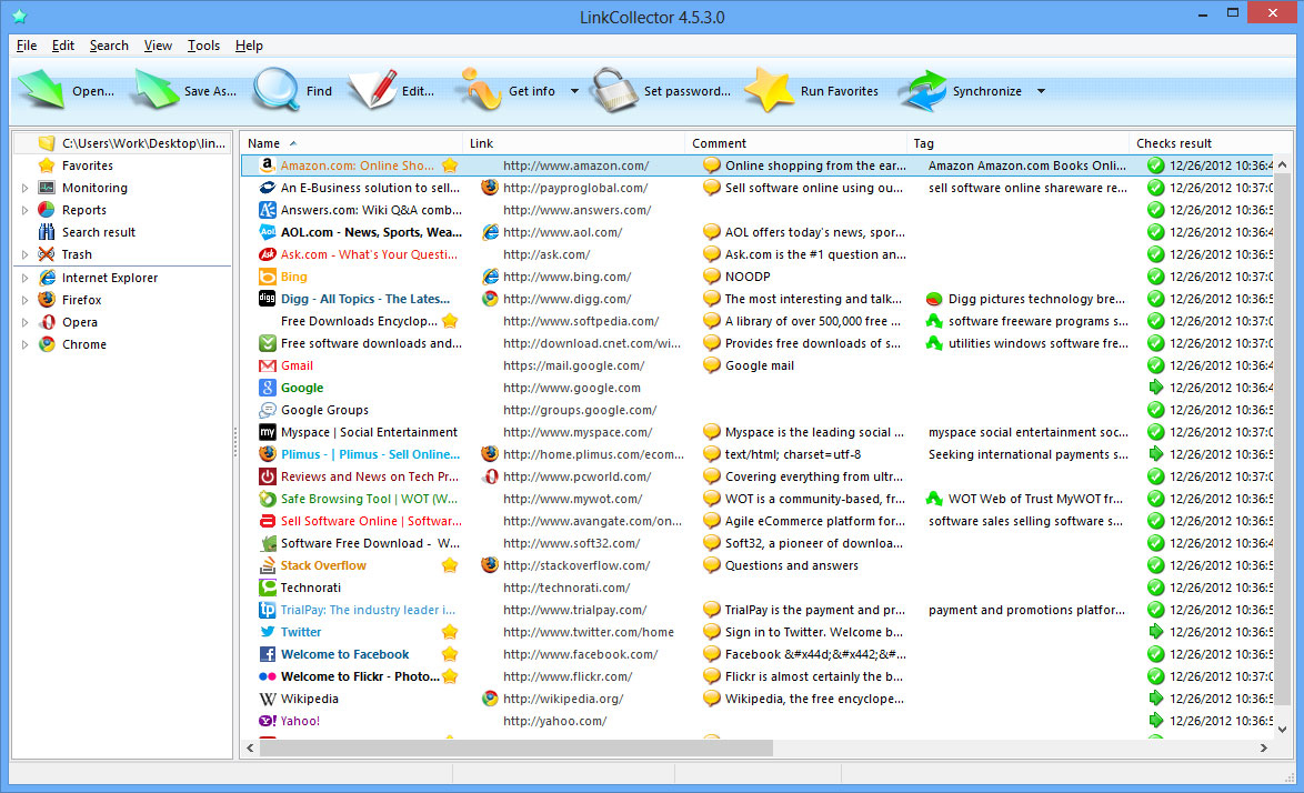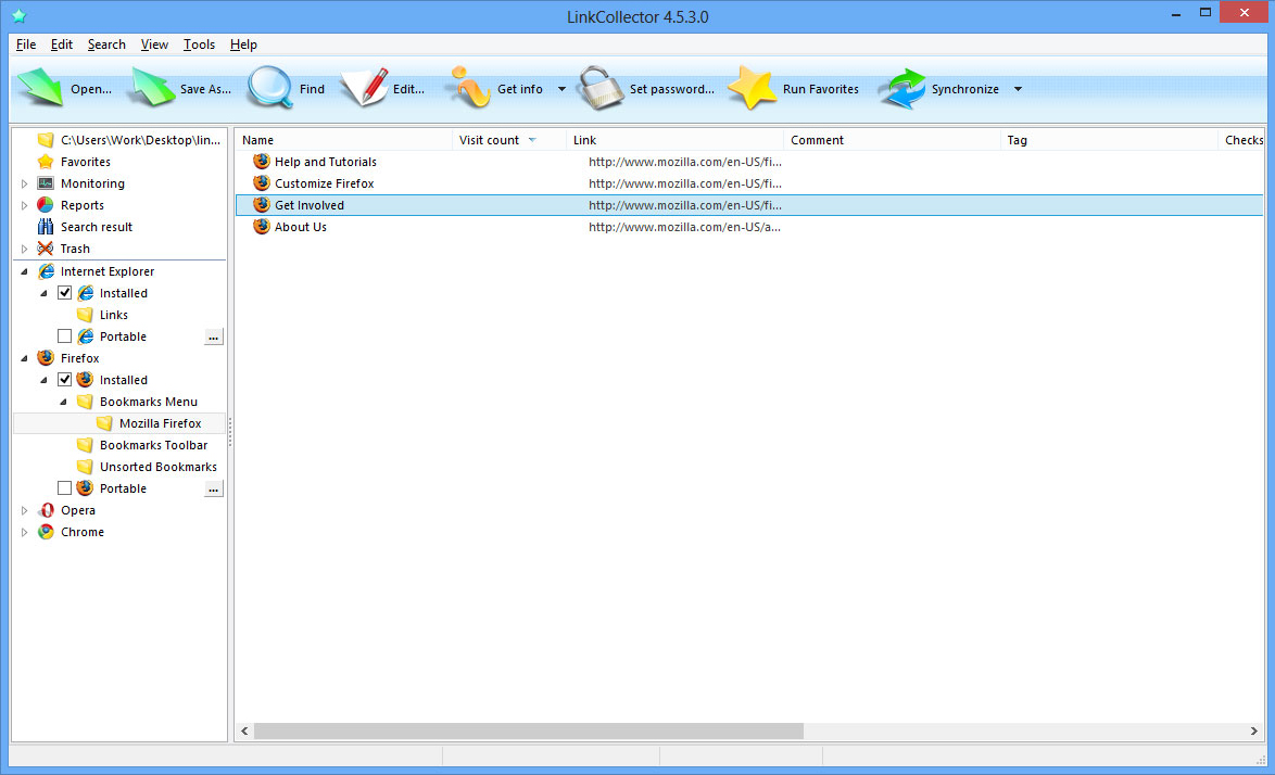 It's easy to get started! Just launch LinkCollector Portable and start importing your favorite sites from Internet Explorer, Firefox, Opera, or Google Chrome! A variety of bookmark file formats are supported, including HTML, SQLite, URL, JSON, and ADR. When you find yourself sitting at a different machine, just pull up LinkCollector Portable and export all or some of your bookmarks to your new or interim browser of choice!