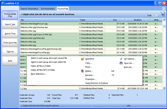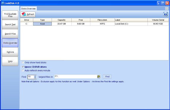 LookDisk's duplicate file functionality is second to none. You can choose exactly where you want your search to be done, providing a full list of folders to be scanned. You can choose if you want to search within .zip archives, and other types of archives. From the exclusion list you can choose folders to be skipped over if you don't want to search them.
