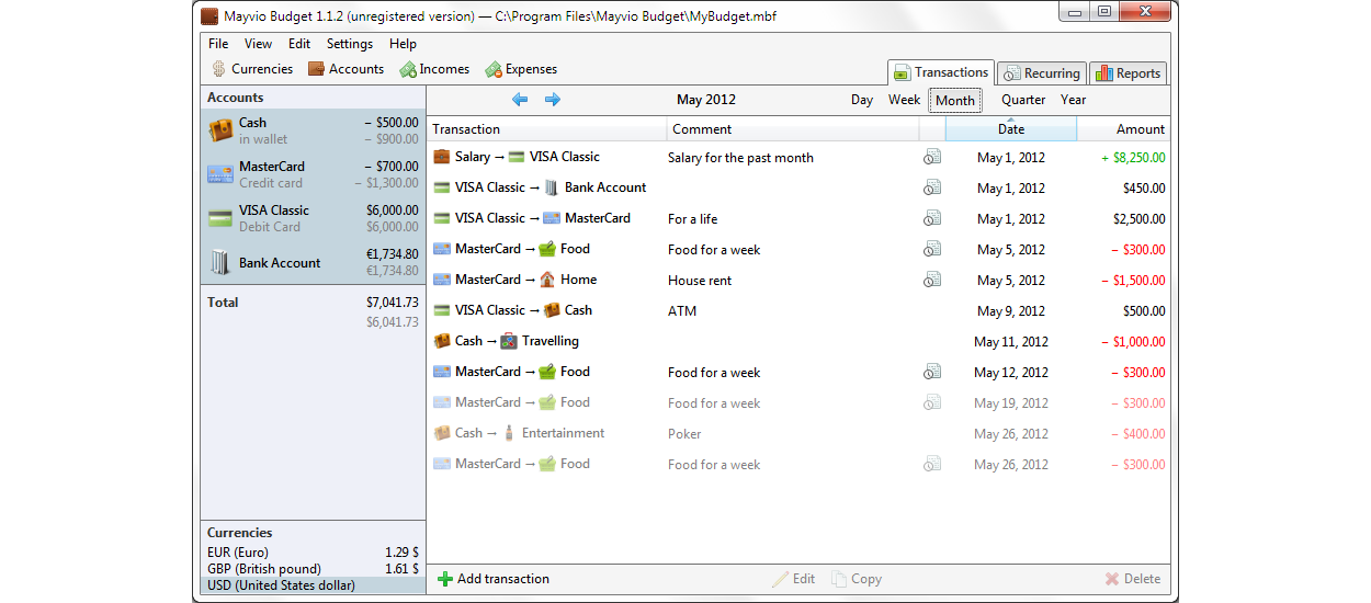 Mayvio Budget is the easiest way to manage your personal and family finances, featuring an overview of all of your financial information on a single screen. With Mayvio Budget, you’ll be able to track multiple accounts, while adding transactions, seeing actual and projected balances, and using period filters to find out exactly what happened with your money in a specific time period.