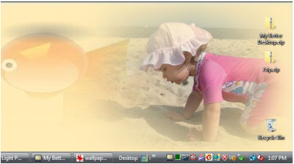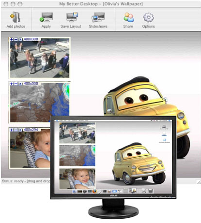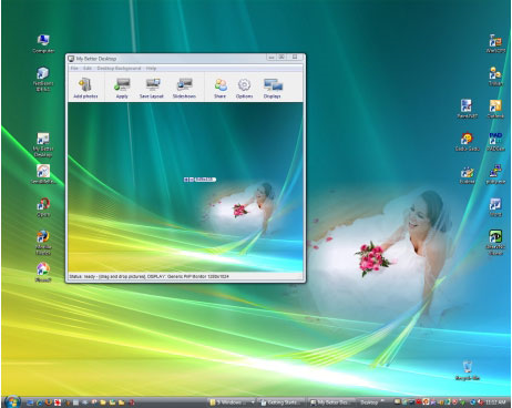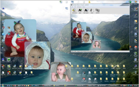 My Better Desktop transforms your background image into a living space populated with your own photos, webcam streams, slideshows, even traffic and weather data, all updated automatically and ever-changing! Customize your space with your own layout of photos and webcam streams, then share it all with your friends and family in a single file. Once loaded, they'll see the same great images as you do on your own computer.