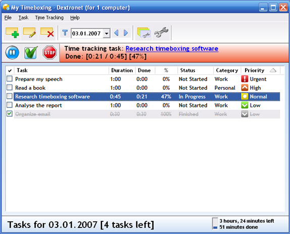 - Keep constant track of time remaining and time elapsed for individual tasks and the entire day.