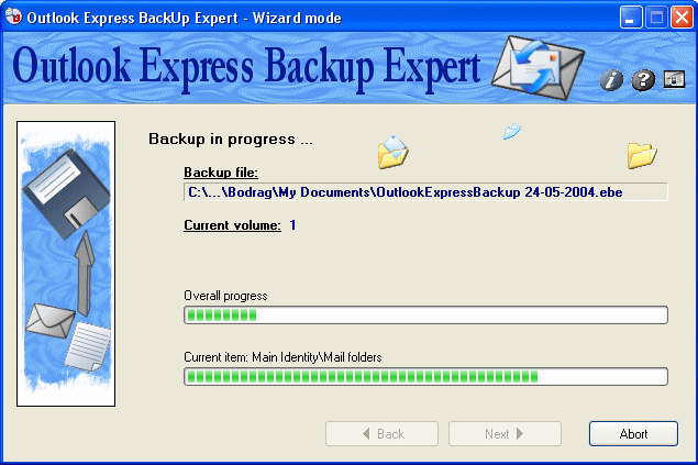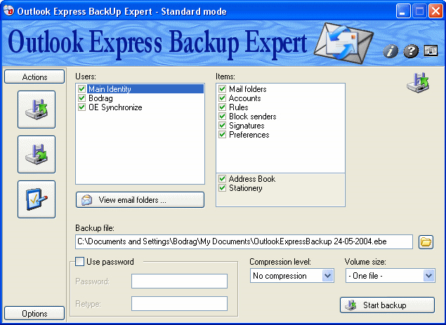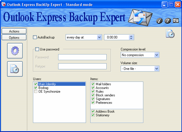 Best of all, Outlook Express Backup Expert is not just for email messages! Using Outlook Express Backup Expert, you can create backups of your identities, address book, message rules, signatures, even your blocked senders list. And if you think about it, you can even use Outlook Express Backup Expert to duplicate your Outlook Express installation on a new computer!