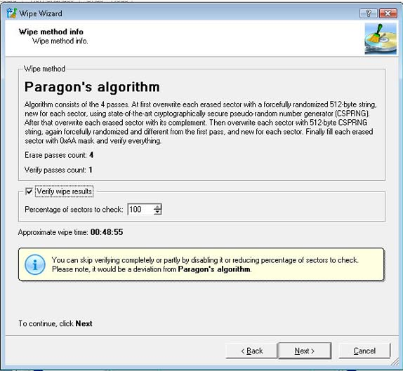 When you run Paragon Disk Wiper 10 Personal, the program's algorithm destroys all of the data on the targeted disk easily and quickly, making it impossible to recover using any present-day technology! You even get your choice of four different wiping patterns, the number of passes for each wipe, and the group of patterns - totaling a whopping 40,000+ possible pass combinations! When it's done, Paragon Disk Wiper 10 Personal presents you with detailed reports of the wipe operation.