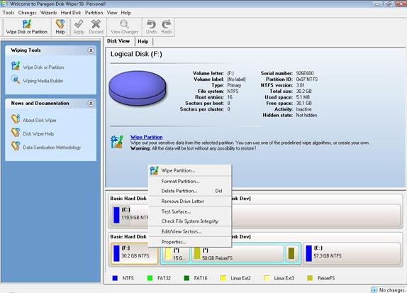 To guarantee that your data is securely deleted, with zero chance of recovery, you need a program like Paragon Disk Wiper 10 Personal! With Paragon Disk Wiper 10 Personal, you can completely and securely erase a partition or an entire hard disk. You can also use Paragon Disk Wiper 10 Personal to clean free space on your drive, to make sure that whatever you've previously deleted stays that way.