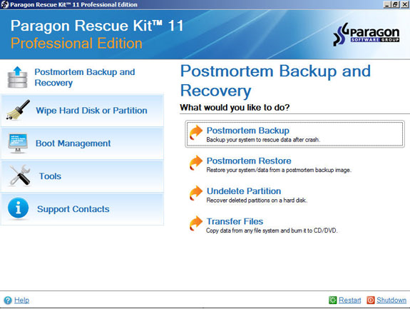 Paragon Rescue Kit 11 Professional is your ultimate solution to curing the majority of boot problems, enabling you to instantly retrieve your data. It supports all popular file systems and the recovery CD allows you to boot into the native Operating System that was installed before your PC crashed. Once you're in, you can retrieve all of your critical data and either save it to a different hard disk or partition or burn it to optical media. Postmortem functionality even lets you backup and restore data AFTER a crash. How easy does that sound?