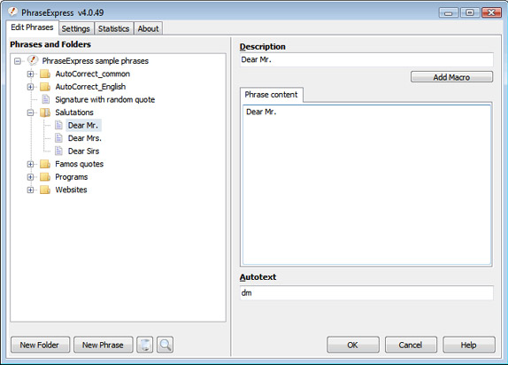 - PhraseExpress' Autotext is so much more powerful when handling text snippets. Phrases can be linked, dynamic variables such as the date, counters or additional manual input including multiple choice input, etc. can be added.
