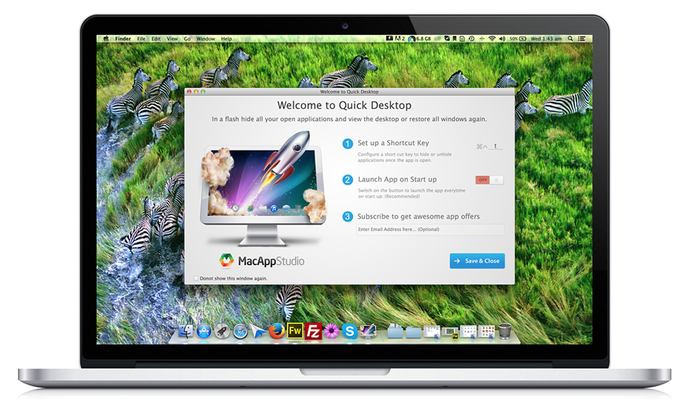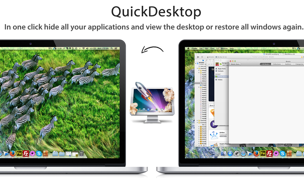 QuickDesktop lets you view the desktop on a Mac with a single click or hotkey that minimizes all open windows. With QuickDesktop, you’ll be able to skip the hassle of closing or minimizing all of those open windows that you forgot you had open. Best of all, you can restore all of your open windows with a second click or keystroke!