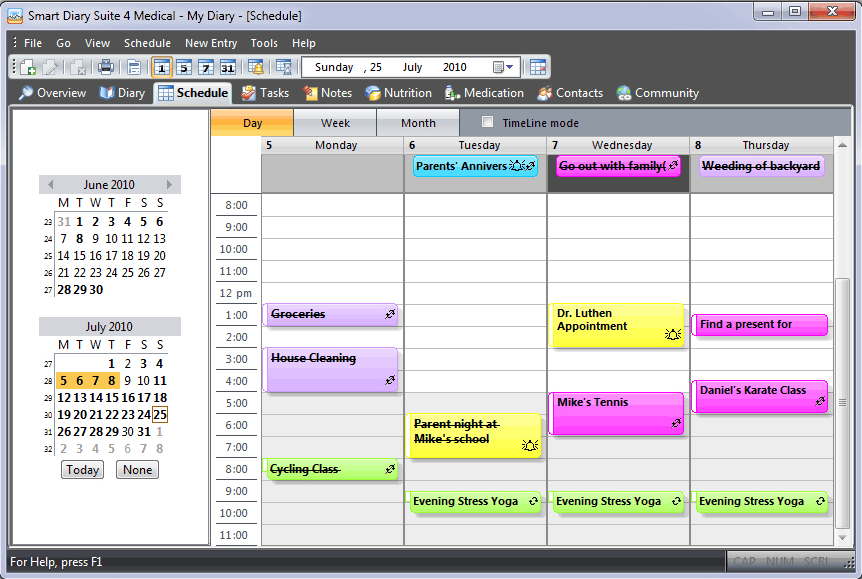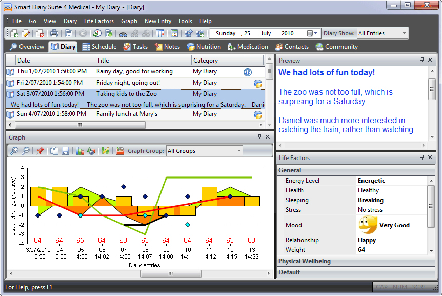 “This diary is perfect for someone who has a mood disorder, such as myself. I need to keep track of my moods, nutrition, doctor's appointments and especially my medication.This is only Diary that I have found that does it ALL. I also find it useful for managing my family and their appointments etc. This is the perfect diary for someone who has medical needs, but also has a busy family lifeThanks Diary SuiteI can't live without it anymore!!!!”