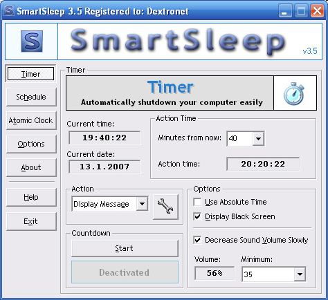The possibilities are endless with SmartSleep. You can listen to music as you drift off into dreamland, and SmartSleep will gradually fade the volume right before shutting down. No more babysitting big downloads that are estimated to take hours - set the SmartSleep application to shut the PC down while you're at work during the day, or asleep at night! You can even schedule your PC to reboot itself periodically!