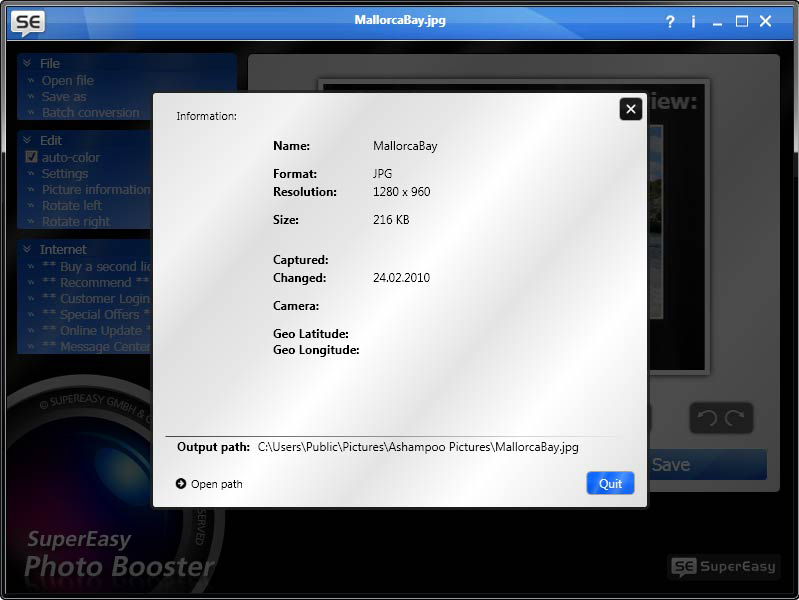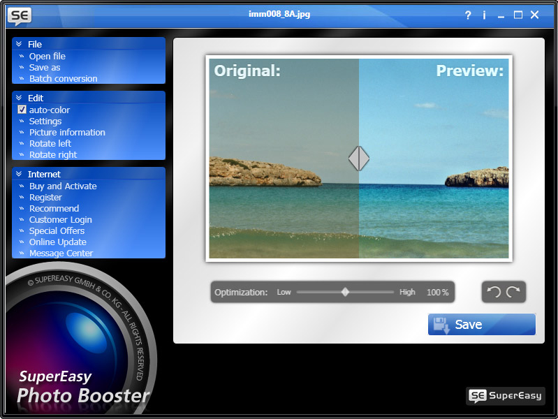 SuperEasy Photo Booster lets you instantly improve your photos, automatically fixing errors with colors, contrast, and brightness. With SuperEasy Photo Booster, you have a program that can automatically detect which parts of your image can be improved, then goes ahead and optimizes them. A handy before and after preview shows you exactly how much better your image looks after SuperEasy Photo Booster is done with it.