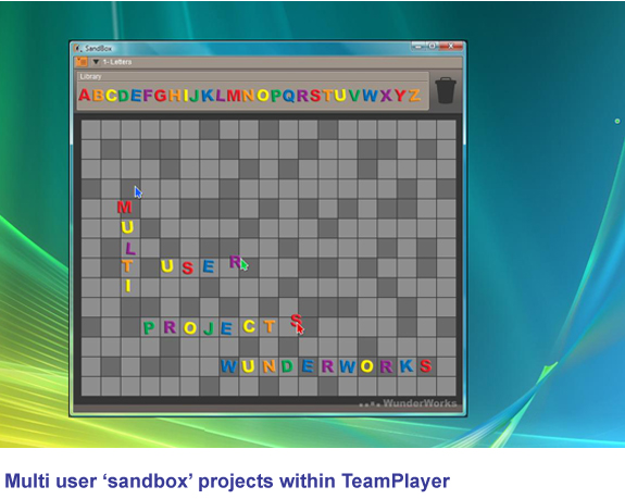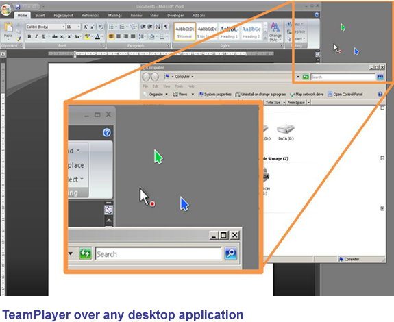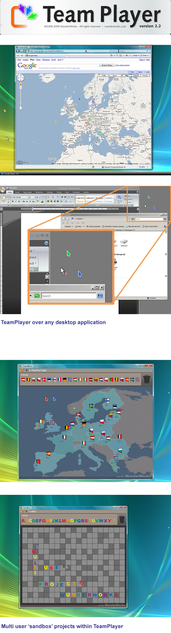 With TeamPlayer installed, you'll be able to teach computing applications faster than ever before by having both you and your trainee operate the computer at the same time! It's like a driving school car with two steering wheels! Or, get everyone who's contributing to a document on TeamPlayer, and let everyone make edits and develop the discussion in real time! Build a game that lets everyone battle it out at the same time! With applications in commercial, educational, industrial, gaming and artistic environments, TeamPlayer is the wave of the future!