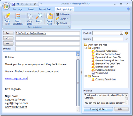 Here's how it works -- Text Lightning gives you instant access to text snippets that you have used to reply to similar email messages in the past. With a single click, any commonly used phrase can be instantly inserted into your email message. It even works with file attachments, embedded image, and rich text formats. All this, right from within Outlook!