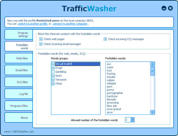 Of course, any savvy parent knows that the dangers of the Internet don't just come in the form of websites. That's why Trafficwasher also gives you the power to ban access to any form of communication that contains forbidden keywords! Instant messages, email communications, websites, and more can all be keyword-filtered. Even banner ads can be blocked!