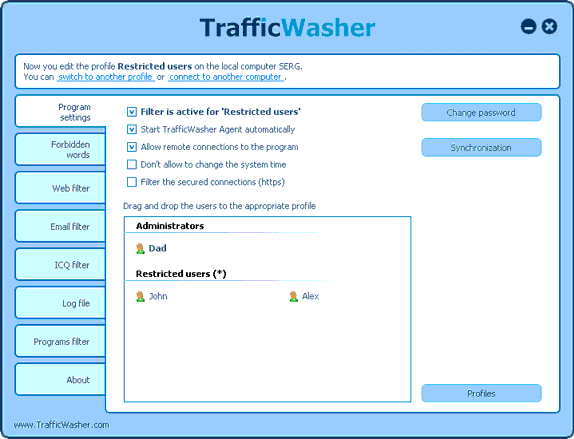 Trafficwasher is the perfect solution to control usage and ensure that your kids stay on the safe side of the Internet! With Trafficwasher, you can enforce a strict time schedule that dictates when your kids are allowed Internet access, both by day of week as well as time of day. You can set up blacklists which will block access to porn sites, as well as entire categories of content such as drugs, cults, and other evil whatnots.