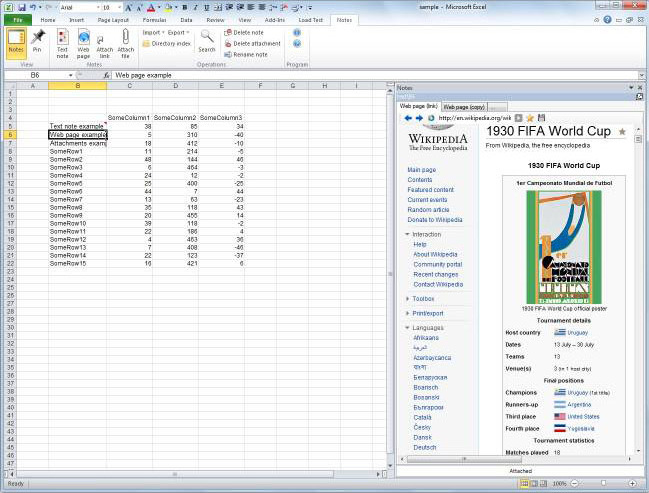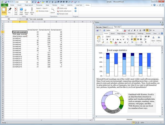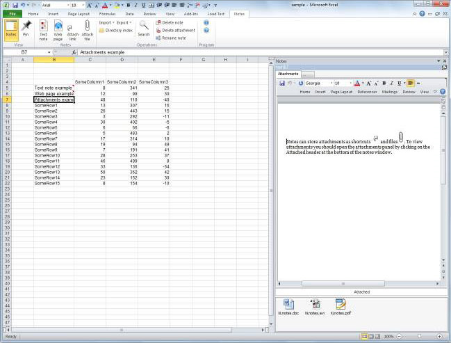 Installing XLnotes gives you a new notes tab right inside of Microsoft Excel. When you want to add a note, just click a button and you have your choice of a text note, a web page, or an attachment! Text notes are fully realized Word documents complete with formatting, while web pages can either be copies of web pages or bookmarks. Lastly, an attachment note has a link to the file on your local drive. The content of any note can be imported and exported to cells, comments, and files easily.